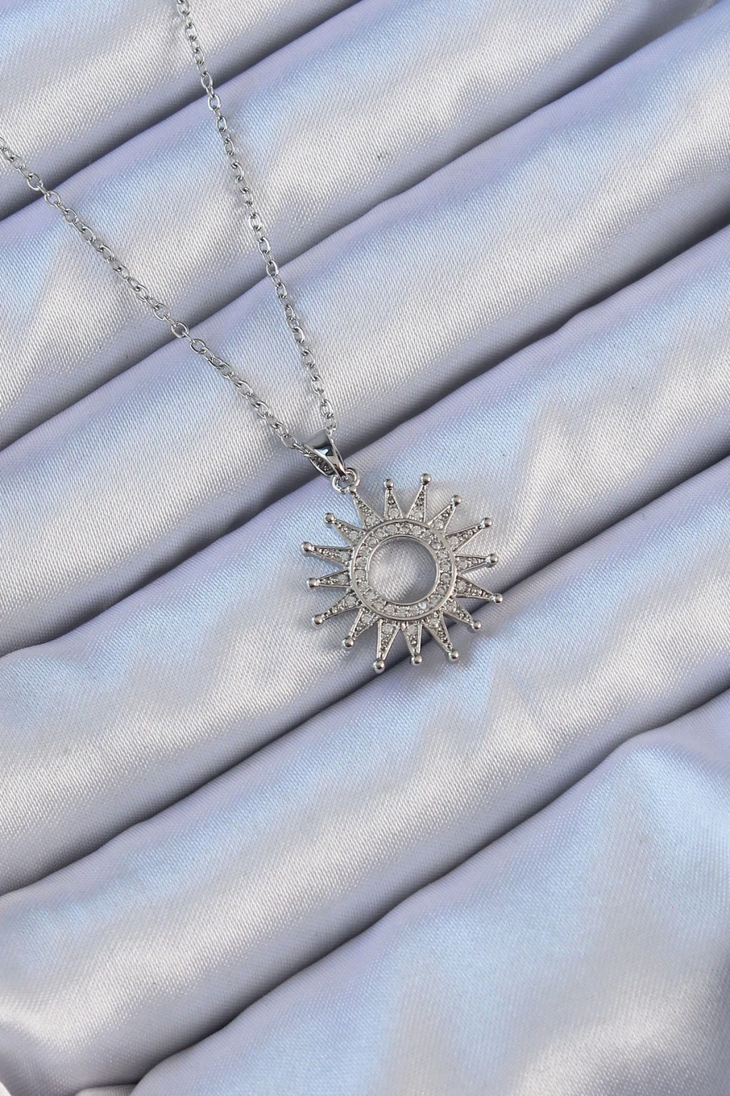 316L Çelik Zincir Gümüş Renk Zirkon Taşlı Parlayan Güneş Kolye