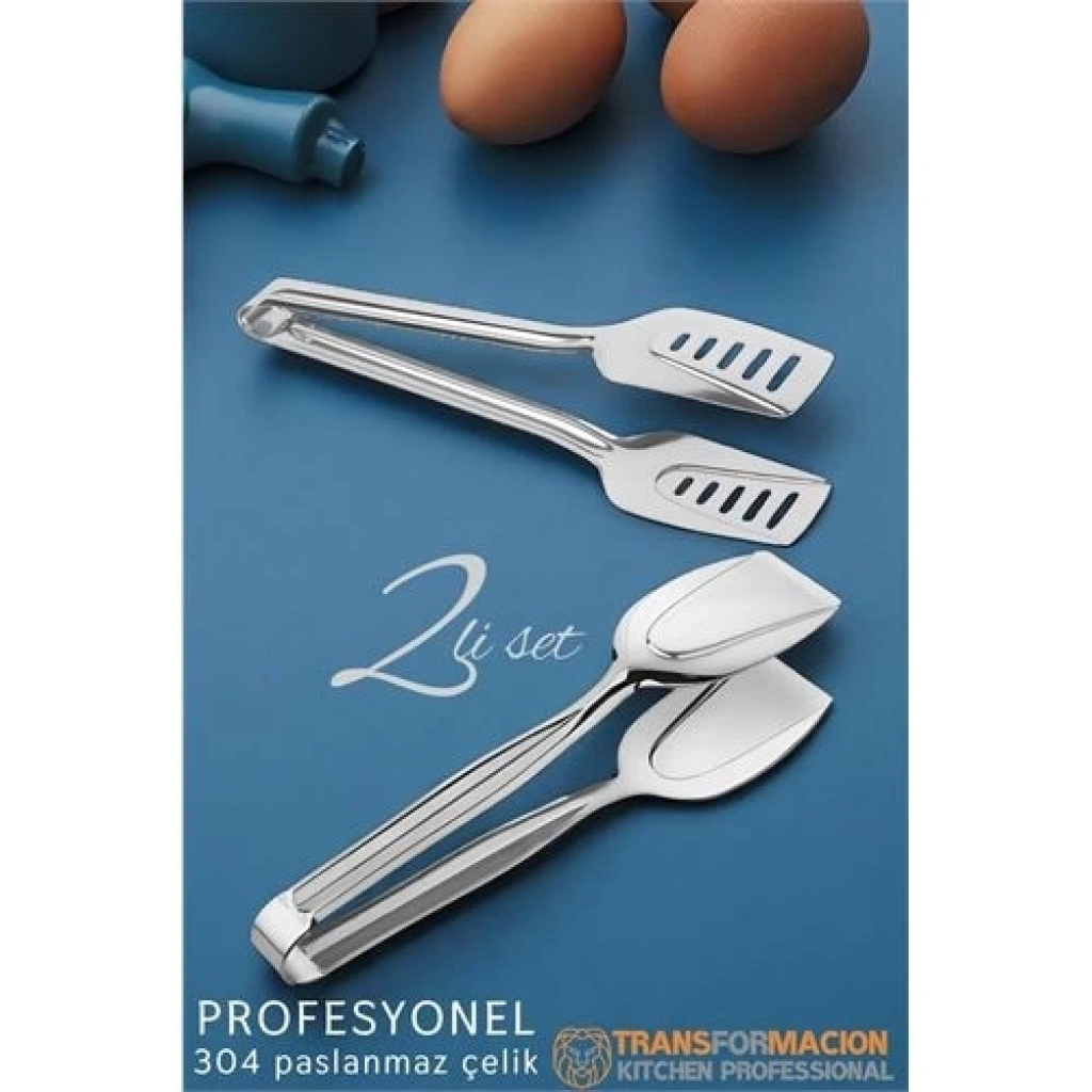 "Bu paslanmaz çelik mutfak seti, 2 parçadan oluşan ergonomik servis aparatlarıyla hem modern sunumlar hem de profesyonel kullanım için idealdir; salata, spagetti ve ızgara servisinde kullanılan bu cooking tools set, hem dayanıklı hem de bulaşık makinesine uygun bir stainless steel kitchen utensils çözümüdür