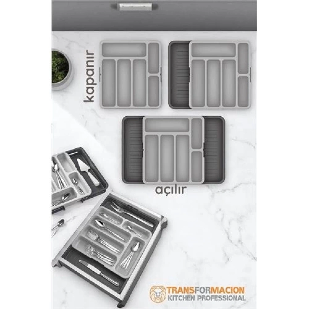 Özellikler: Ayarlanabilir Genişlik: Üç farklı genişlik seçeneği sunar: 31 cm, 42 cm ve 53 cm Ayarlanabilir olması, organizatörü ortama göre optimize etmenize olanak tanır. Sabit Yükseklik: Organizerin yüksekliği 35 cm olarak sabit tutulmuştur. Fonksiyonel Bölmeler: Kaşık, çatal, bıçak gibi mutfak gereçleriniz için özenle tasarlanmış bölmeler sayesinde, eşyalarınız düzenli bir şekilde yerleştirilir. Ergonomik ve Modern Tasarım: Kırmızı oklarla belirtilen ayarlanabilir yapı, kullanım kolaylığı sağlar ve estetik duruşu destekler.