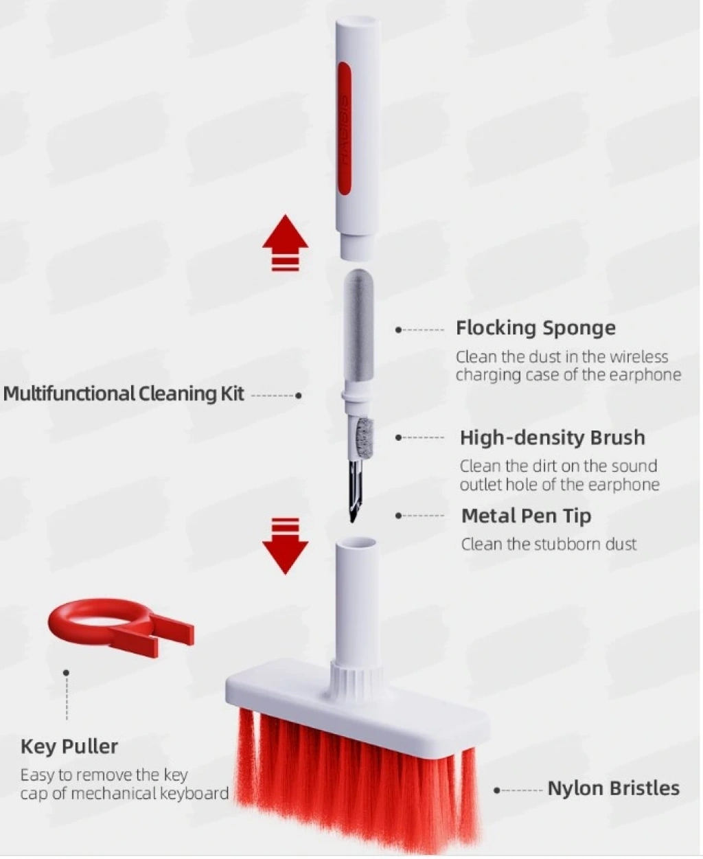 Sünger kulaklık kablosuz şarj durumunda toz temizleyebilirsiniz. Fırça, kulaklığın ses çıkış deliğindeki kiri temizleyebilir. Metal kalem ucu inatçı tozu temizleyebilir