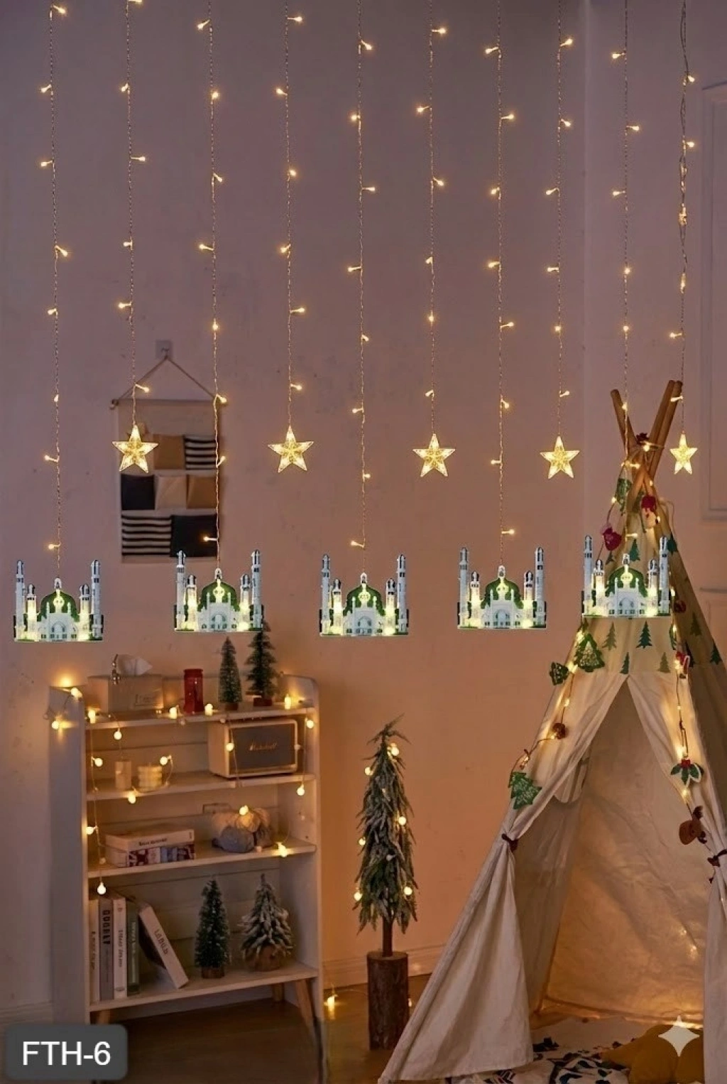 Ev ve yaşam alanlarınıza şık ve anlamlı bir atmosfer katmak için tasarlanan perde LED ışık, Ramazan ve özel gün dekorasyonları için ideal bir tercihtir. Yıldız ve ay–cami figürlerinin zarif uyumu sayesinde hem klasik hem de modern dekorasyonlarla mükemmel uyum sağlar.