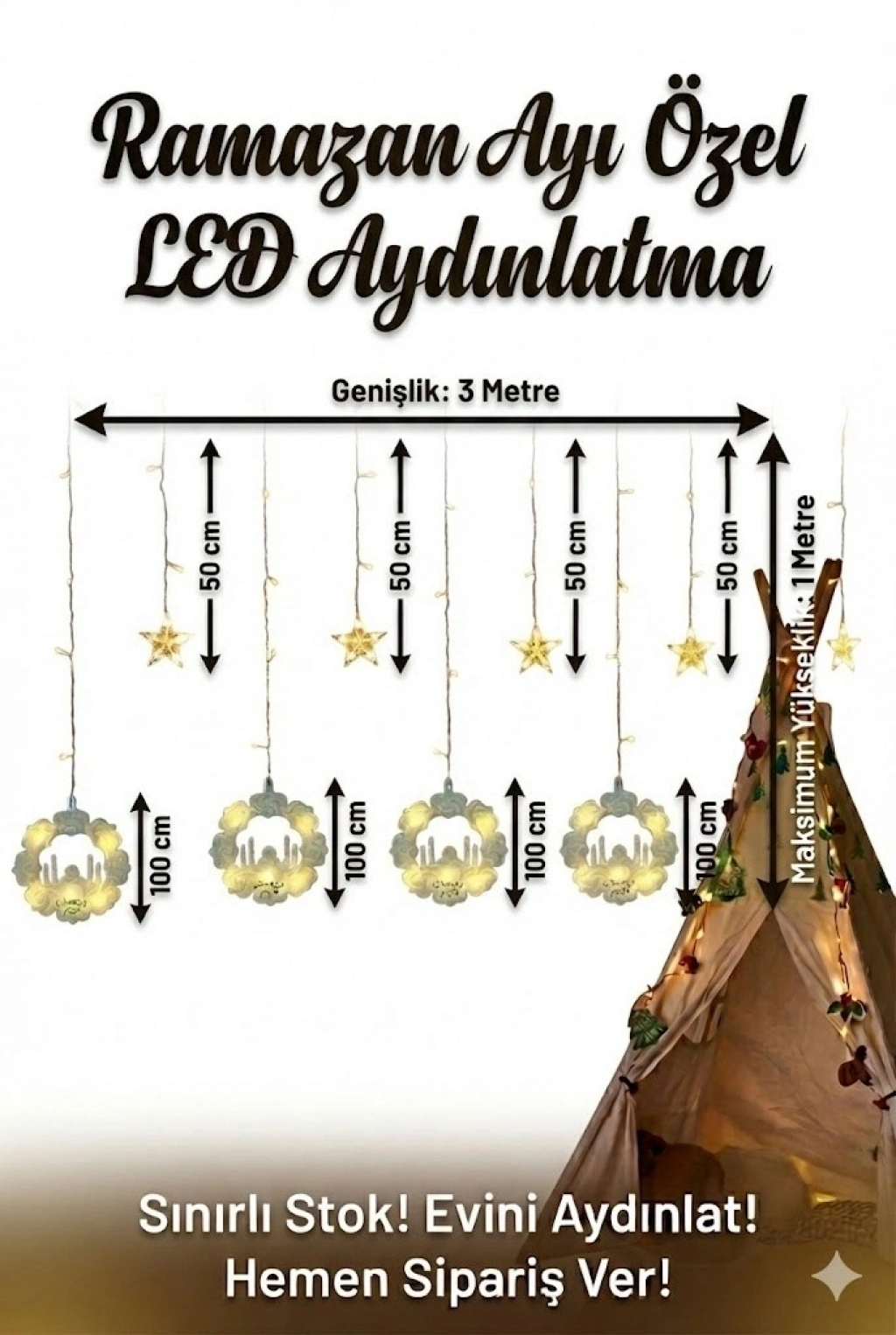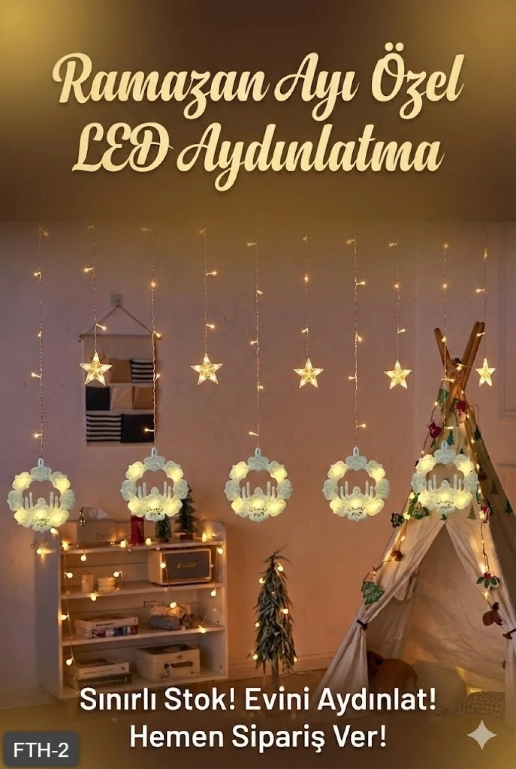 Ev ve yaşam alanlarınıza şık ve anlamlı bir atmosfer katmak için tasarlanan perde LED ışık, Ramazan ve özel gün dekorasyonları için ideal bir tercihtir. Yıldız ve ay–cami figürlerinin zarif uyumu sayesinde hem klasik hem de modern dekorasyonlarla mükemmel uyum sağlar.