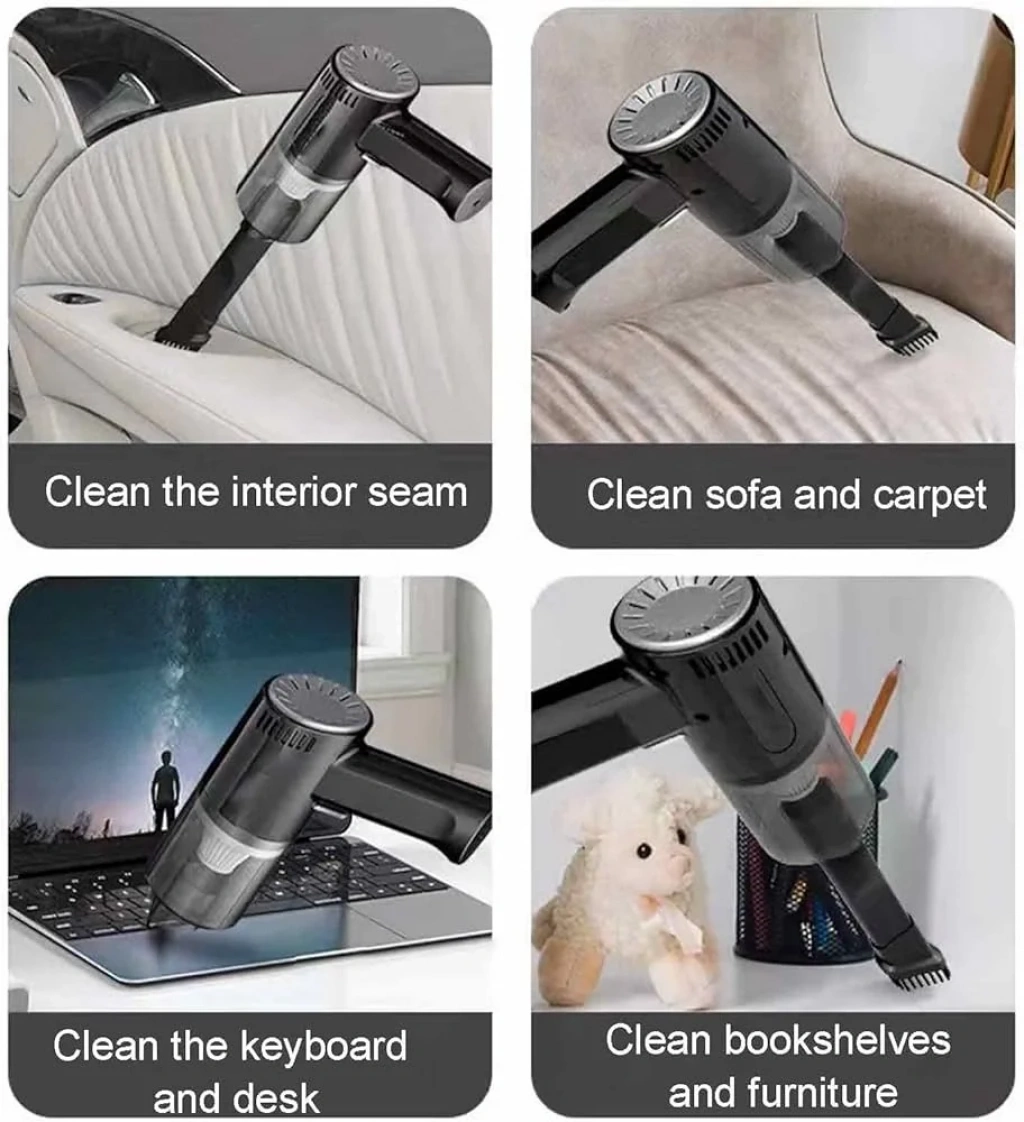 Hızlı ve Kolay Şarj: Type-C bağlantısı sayesinde hızlı şarj imkanı sunan bu cihaz, sürekli enerji kaynağına ihtiyaç duymadan uzun süreli kullanım sağlar. Gelişmiş Pil Teknolojisi: Li-ion pil teknolojisi ile donatılan bu güçlü süpürge, daha verimli ve uzun ömürlü bir temizlik deneyimi sunar. Kompakt ve Pratik Tasarım: Kolay saklanabilen ve az yer kaplayan yapısıyla Mini Şarjlı Araç Süpürgesi, aracınızda veya çantanızda rahatlıkla taşınabilir. Derinlemesine Temizlik: Aracınızın koltukları, döşemeleri ve zeminlerini etkili bir şekilde temizler, hijyenik bir sürüş deneyimi sağlar. Gelişmiş Vakum Emme Yeteneği: Toz ve kirleri etkili bir şekilde ortadan kaldırırken, hassas yüzeylere zarar vermez. Kokpit Temizleme Fırçası: Araç içi detaylı temizlik için ekstra esneklik ve kolaylık sunar. Geniş Kullanım Yelpazesi: Evde, ofiste veya tatilde, her yerde şebeke bağlantısına ihtiyaç duymadan kullanabilirsiniz. Zaman Tasarrufu: Hızlı ve etkili temizlik yapısıyla vakit kazandırır. Kuru kirleri anında vakumlayarak hızlı bir şekilde temizlik yapmanızı sağlar. Ergonomik Tasarım: El-yapışma konforunuza uygun, sessiz çalışma özelliğiyle rahat bir kullanım sunar. Kablosuz Temizlik Özgürlüğü: Kabloların kısıtlamalarından kurtulun ve alanınızın en dar köşelerine bile ulaşın. Güçlü Emiş Performansı: Çift yüksek performanslı motorlar ve 5500pa emiş kapasitesi ile kapsamlı ve verimli temizlik. Kolay Şarj Edilebilirlik: Büyük kapasiteli pil ve USB şarj özelliği ile uzun süreli kullanım imkanı. Taşıması Kolay: Küçük boyutu ve hafifliği ile seyahat ve çeşitli temizlik görevleri için ideal. Geniş Uygulama Alanı: Evlerde, ofislerde, arabalarda ve evcil hayvan tüyü, zemin, halı ve klavye temizliği gibi geniş bir kullanım alanı sunar.
