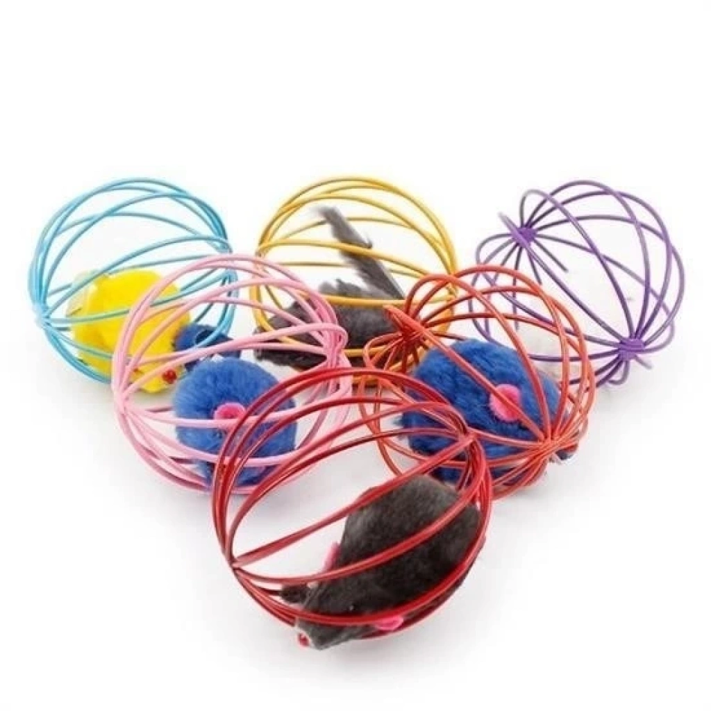 Renkli Metal Kafesli Peluş Fareli Kedi Köpek Oyuncağı Oyun Topu 6 cm