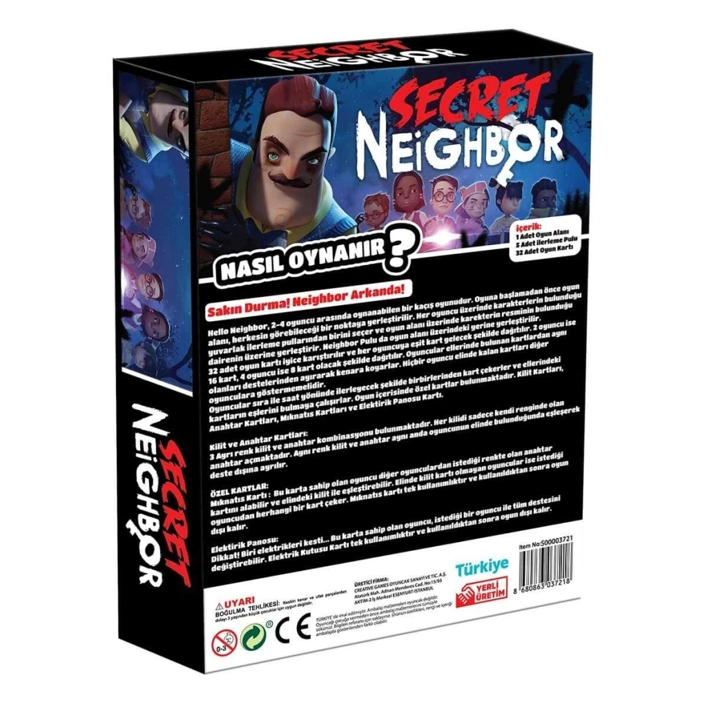 Hello Neighbor, 2-4 oyuncu arasında oynanabilen bir kaçış oyunudur. Oyuna başlamadan önce oyun alanı, herkesin görebileceği bir noktaya yerleştirilir. Her oyuncu üzerinde karakterlerin bulunduğu yuvarlak ilerleme pullarından birini seçer ve oyun alanı üzerinde karakterin resminin bulunduğu dairenin üzerine yerleştirir. Neighbor pulu da oyun alanı üzerindeki yerine yerleştirilir. 32 adet oyun kartı iyice karıştırılır ve her oyuncuya eşit kart gelecek şekilde dağıtılır. 2 oyuncu varsa 16 kart, 4 oyuncu varsa 8 kart olacak şekilde dağıtılır. Oyuncular ellerinde bulunan kartlardan aynı olanları destelerinden ayırarak kenara koyarlar. Hiçbir oyuncu elinde kalan kartları diğer oyunculara göstermemelidir.