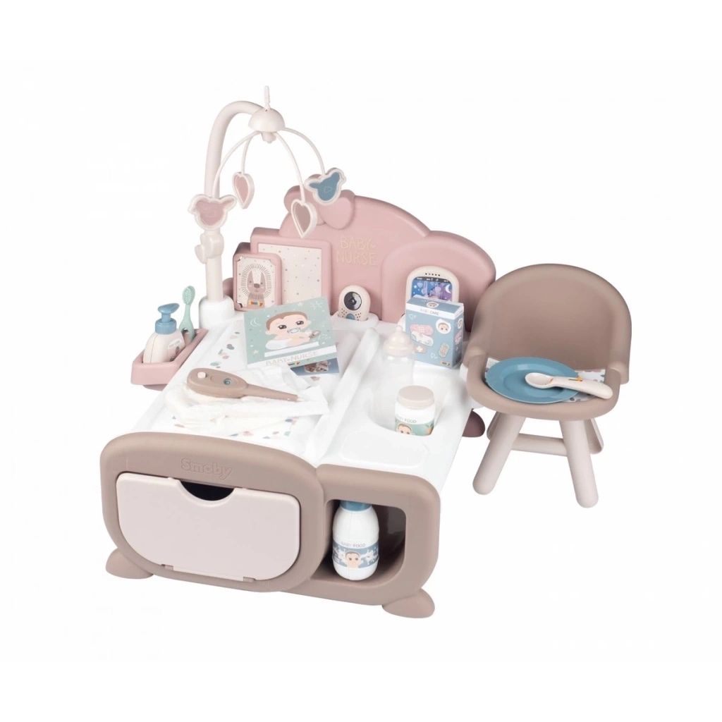 Smoby Baby Nurse Cocoon bebek oyun odası, üç oyun alanını tek bir üründe bir araya getiren büyüleyici bir üründür. Böylece bebek ebeveynleri, tıpkı anne ve babaları gibi, minik yavrularına bakabilirler. Cocoon bebek odası, özelleştirilebilir bir resim çerçevesi, dönen bir mobil ve farklı ninniler ve bir kukla kamerası içeren elektronik bir bebek telefonuyla donatılmış birleşik bir uyku ve değiştirme alanından oluşur. Yemek alanı, bebeklerin ilk lapa yemeklerini yiyebilecekleri entegre tepsili döner bir yüksek sandalye içerir.